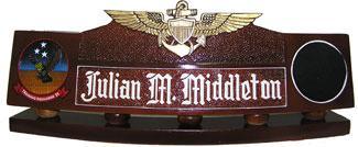 The desknameplate's approximate dimensions are: Width: 16" Height: 7" Depth: 3".
