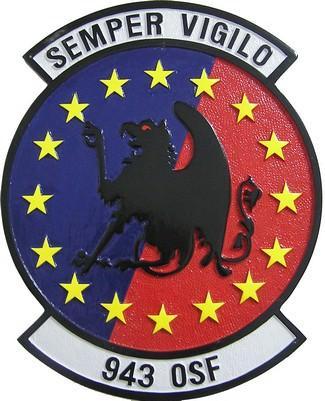 943 OSF Patch Plaque: The squadron's motto is ""Semper Vigilo"" that is also ,ocated on the top part of their seal with ""943 OSF"" at the bottom. Its main colors are Red, Yellow and Blue, 16 stars surrounding the black dragon."