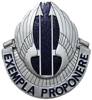 11th AVN: 11th AVN??s motto EXEMPLA PROPONERE means To Set Forth Examples. The symbolism of insignia: Blue field ?? refers to the sky, silver wings refers to Aviation. The two silver spears allude to combat readiness and it also simulates the numeral 11 which is the designation of the unit.