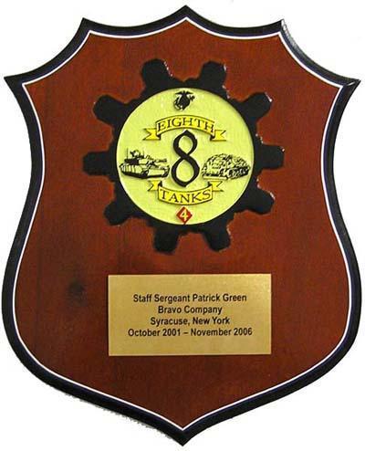 Shield plaques are perfect for U.S. Marine Corps Reserve logos/patches. There are seven shapes to choose from. Size starts from 8" x 10". The squadron logo is carved in solid mahogany wood in 3D relief and painted in full color or as specified. It is typically placed at the center with inscription or a brass plate at the bottom. This item can be customized according to customer's preference. Mock up design is absolutely free!