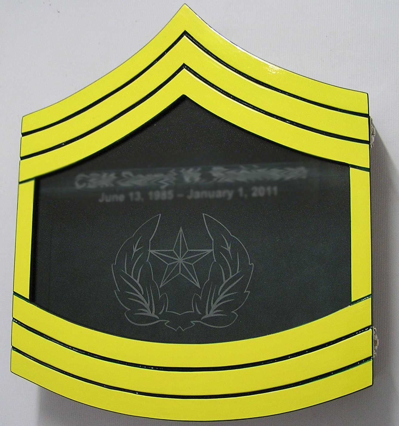 These Display Shadow Boxes are manufactured to order at our own factory and using solid kiln-dried mahogany, with real glass used in the front panel and quality nickel clasps. All Boxes are able to accommodate a 3' x 5' ceremonial flag. The interior is lined in the highest quality cushioned velvet cloth material allowing you to pin your medals and other items inside the box. The front panel lifts from the Box allowing easy access to the interior. The front panel latches are made of the highest quality nickel clasps that will not tarnish over time. Eagle etching standard and included in the price. Rating etching and/or name etching is an option at extra cost. Please see related items below.