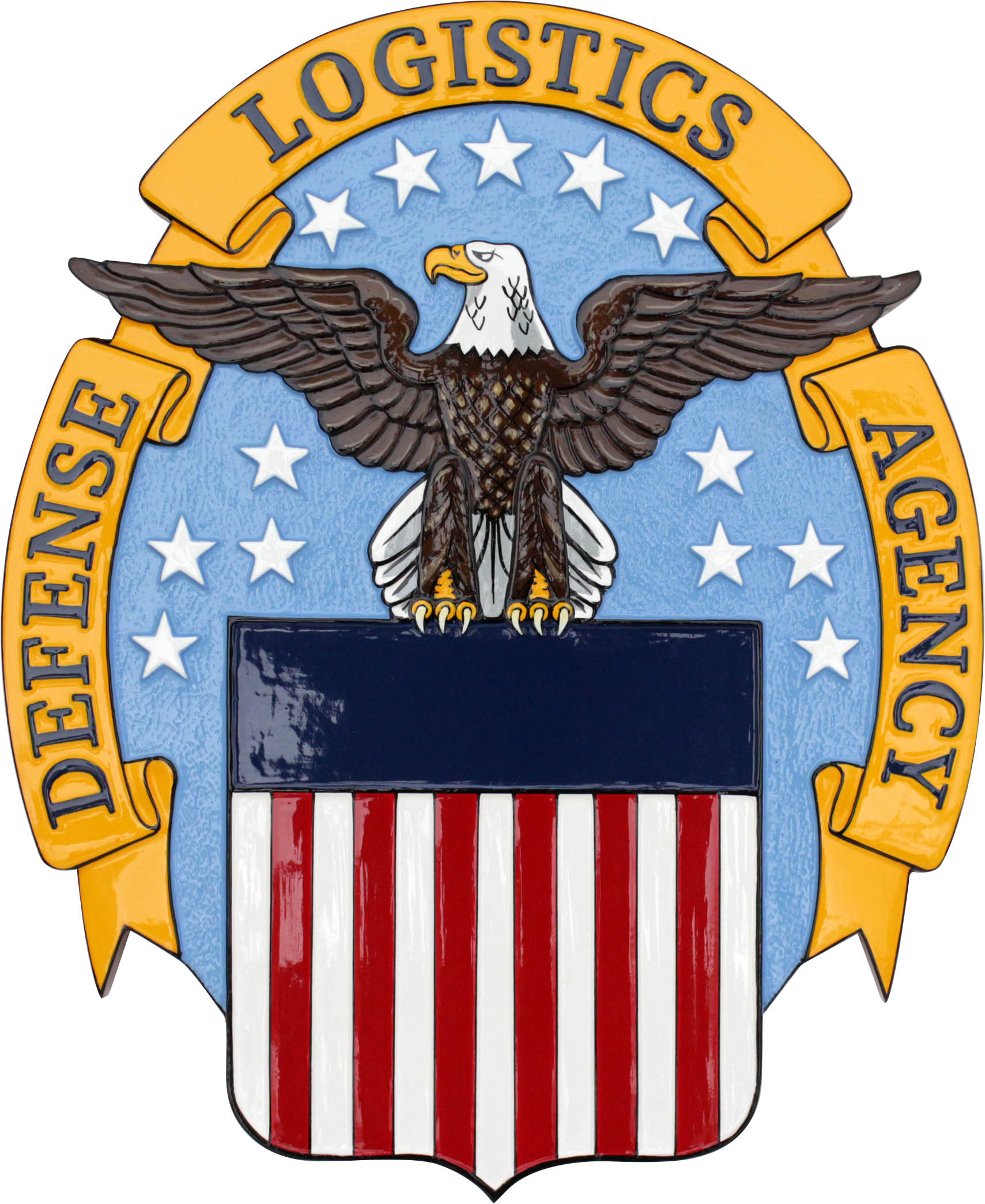 This plaque of Defense Logistics Agency, with its sophisticated design, should be recognized by everyone who visits your office or department. The Defense Logistics Agency is engraved at the outer layer with a painted yellow background color. At the center, there are 13 stars carved in blue around the grey eagle at the top of a red and white stripes design. The fact that it is 100% made of quality mahogany and not from a cheap hollow stuff or fake wood made from plastic makes it more fantastic! It is hand-carved and hand-painted in detailed 3D-look giving eye-catching effect to the plaque when hung or displayed on walls.