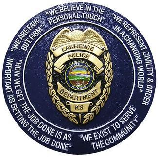 Lawrence Police Department Seal Plaque is a very detailed plaque with State of Kansas seal and metallic gold finish badge at the center, with hand painted wordings of the City of Lawrence's Five Guiding Principles.