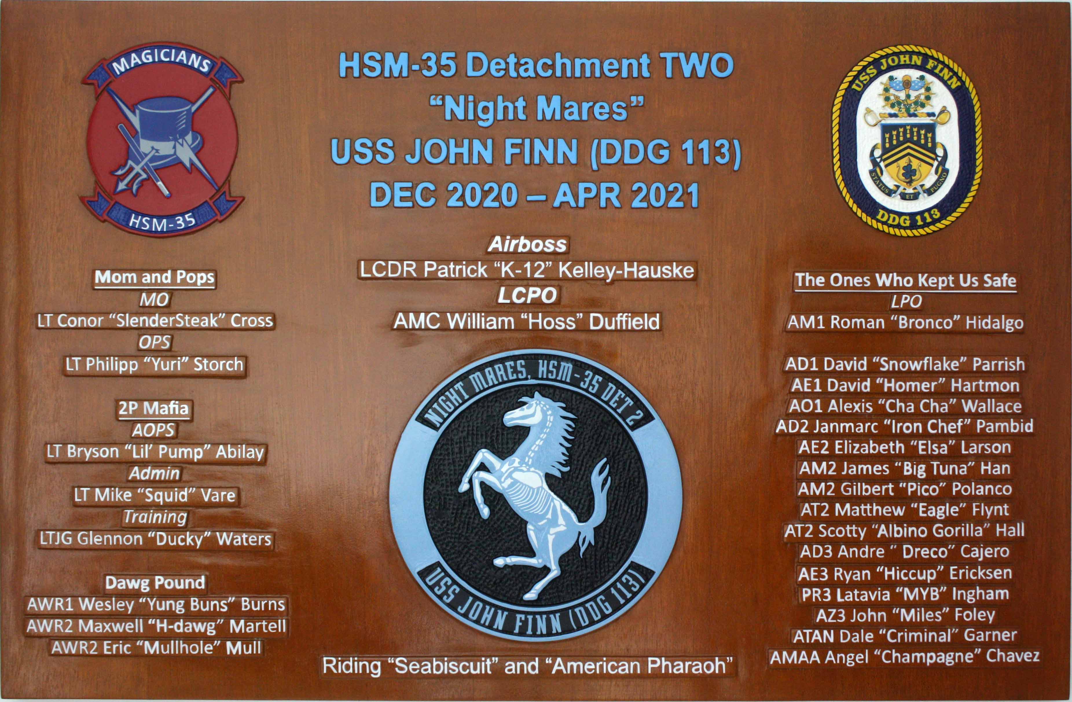 This Cruise Deployment Plaque is made from 100% mahogany handcrafted in full detail 3D look. This plaque was custom made for the service men and women of the USS John Finn in 2021 for their "Night Mares" deployment of that year.