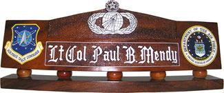 The desknameplate's approximate dimensions are: Width: 16" Height: 7" Depth: 3".