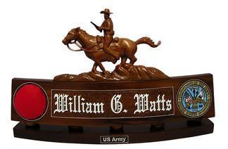 The Buffalo Soldier Desk Nameplate is made from solid, dried, kiln mahogany wood. It is hand carved in full 3D relief, hand painted and finished. This Desk nameplate is a perfect retirement gift, graduation gift or a presentation and recognition award