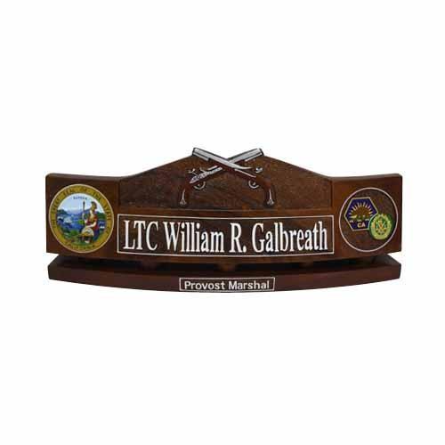 Look at this custom desk nameplate, the top design shows a crossed riffle and there are two emblems carved on both sides of the desk nameplate. This is a state desk nameplate given to LTC William Galbreath.