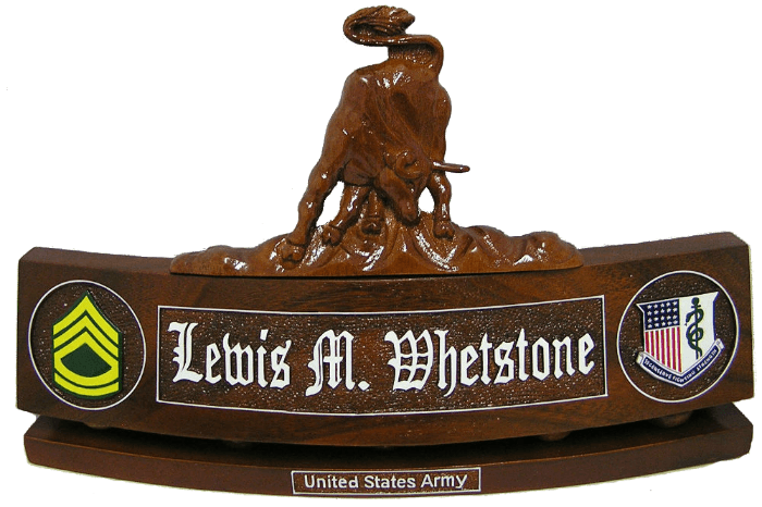 The desknameplate's approximate dimensions are: Width: 16" Height: 7" Depth: 3".