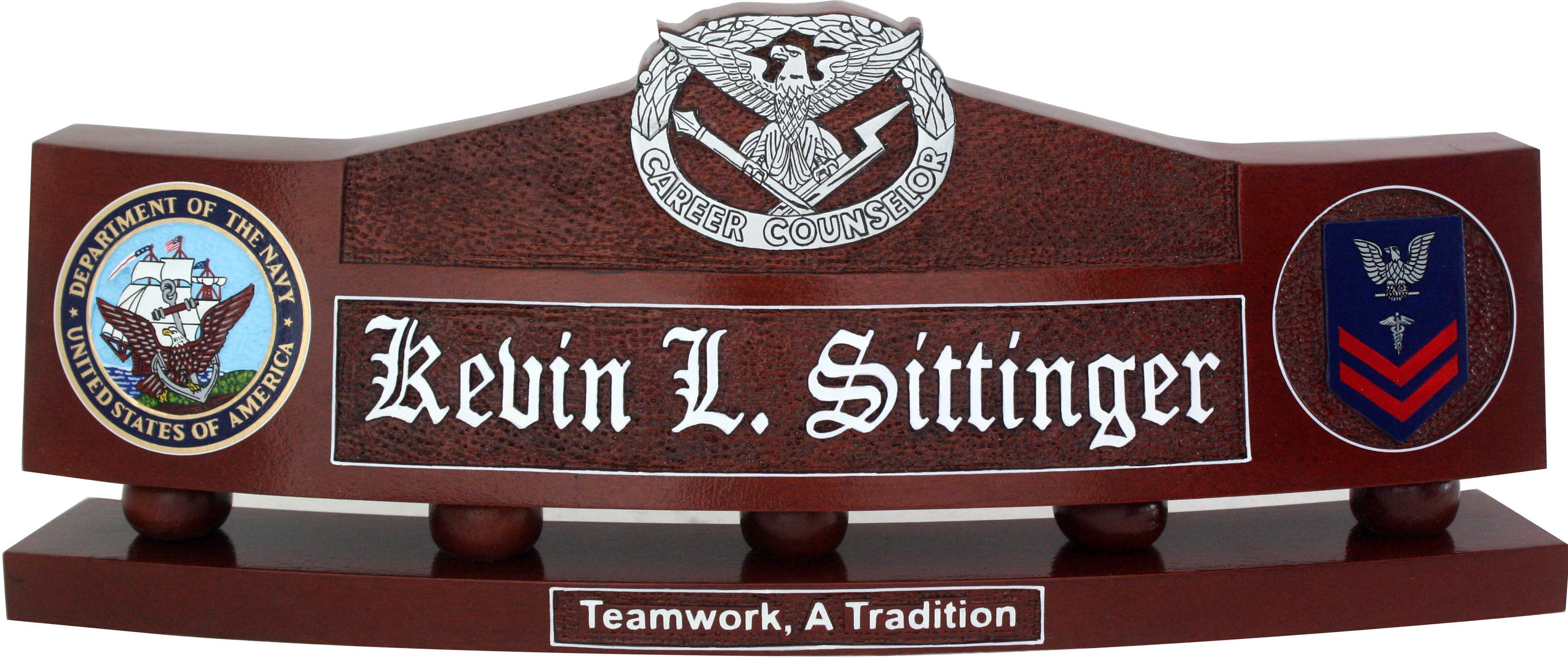 The desknameplate's approximate dimensions are: Width: 16" Height: 7" Depth: 3".