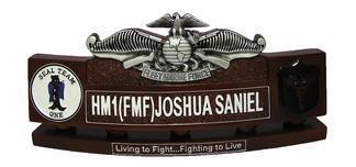 This Oversize Insignia Custom Desk Nameplate is made from solid, dried, kiln mahogany wood. It is hand carved in full 3D relief, hand painted and finished. This Desk nameplate is a perfect retirement gift, graduation gift or a presentation and recognition award