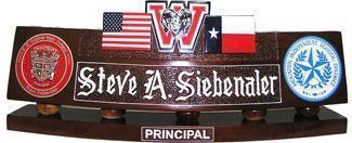 The desknameplate's approximate dimensions are: Width: 16" Height: 7" Depth: 3".