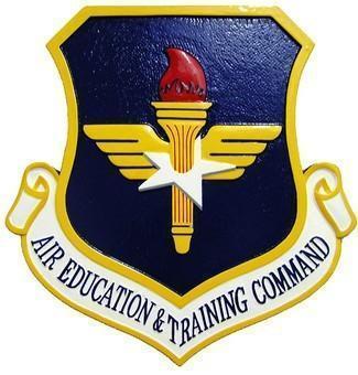 This solid mahogany wall plaque shows the Air Education and Training Command Crest.This hand carved and hand painted wooden plaque is perfect as a wall plaque or podium plaque.