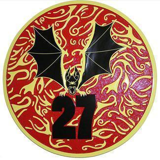 27 ISS: The seal's main colors are Yellow. Red and Black. It has the black bat at the center and below the bat's feet is the number 27 in black letterings."