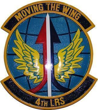 4th LRS Seal Plaque: The squadron's motto is ""Moving The Wing"". Its seal ha a wings and arrows in Red, White and Blue pointing upwards, it alsp have the globe as the background of the seal."