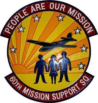 These solid mahogany wall plaques show the official patch of the 60th Mission Support Group Patch. Hand carved and hand painted mahogany wood plaque. It is perfect as a wall plaque or podium plaque. Fantastic addition to any memorabilia collection. Great Air Force retirement gift, air force graduation gift, or air force recognition awards. A recessed hook enables the plaque to hang flush against any wall. 60th Mission Support Group Patch Plaque: The 60th Mission Support Group includes the 60th Civil Engineer Squadron, 60th Logistics Readiness Squadron, 60th Contracting Squadron, 60th Communications Squadron, 60th Security Forces Squadron, 60th Services Squadron, 60th Aerial Port Squadron and 60th Mission Support Squadron -- are responsible for mission readiness, aerial port operations and the day-to-day activities which help Travis run like its own city.