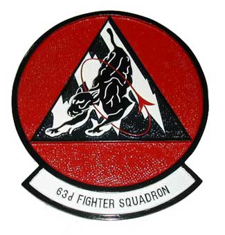This solid mahogany wall plaque shows the 63rd Fighter Squadron Plaque Logo or Emblem.