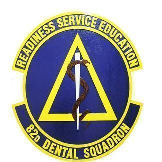 82D Dental Squadron Seal Plaque: Its main color is Yellow and Blue and they are under the Dept of Air Force. The words ""Readiness Service Education"" are on the top of the image while the words ""82D Dental Squadron"" are below the image of their seal with the caduceus symbol at the center part."