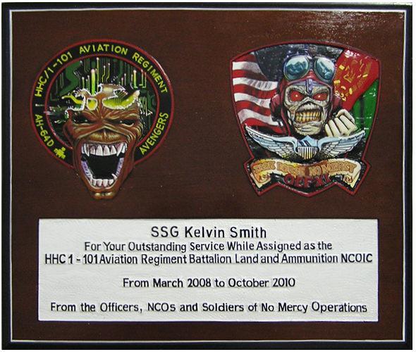 This custom-design presentation plaque we made for the 101 Aviation Regiment Battalion is made of the finest mahogany and is in dark wood tone finish. The two emblems at the top and the name of the recipient and dedication wording at the bottom are engraved in 3D relief which gives life to it when hung or displayed.