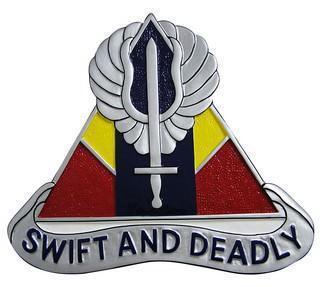 The 13th Aviation: The winged sword in the 13th AVN's emblem refers to the combat mission of the Battalion. The equilateral triangle/delta refers to the Mekong river delta, Vietnam where the organization served. The three colors used to symbolize the three basic combat branches. The organization's motto is Swift and Deadly.