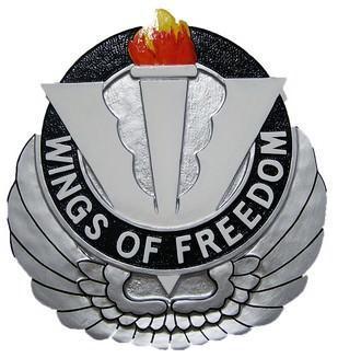 212th Aviation Battalion: The emblem suggests a prescribed drop down zone and the arrowhead piercing it symbolizes the placement of men and materials within the zone. The flaming torch and wings refer to the unit's motto Wings of Freedom.