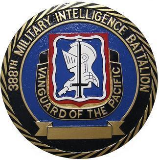 This solid mahogany wall plaque shows the 388th Military Intelligence Battalion Seal Plaque. This hand carved and hand painted wooden plaque is perfect as a wall plaque or podium plaque.