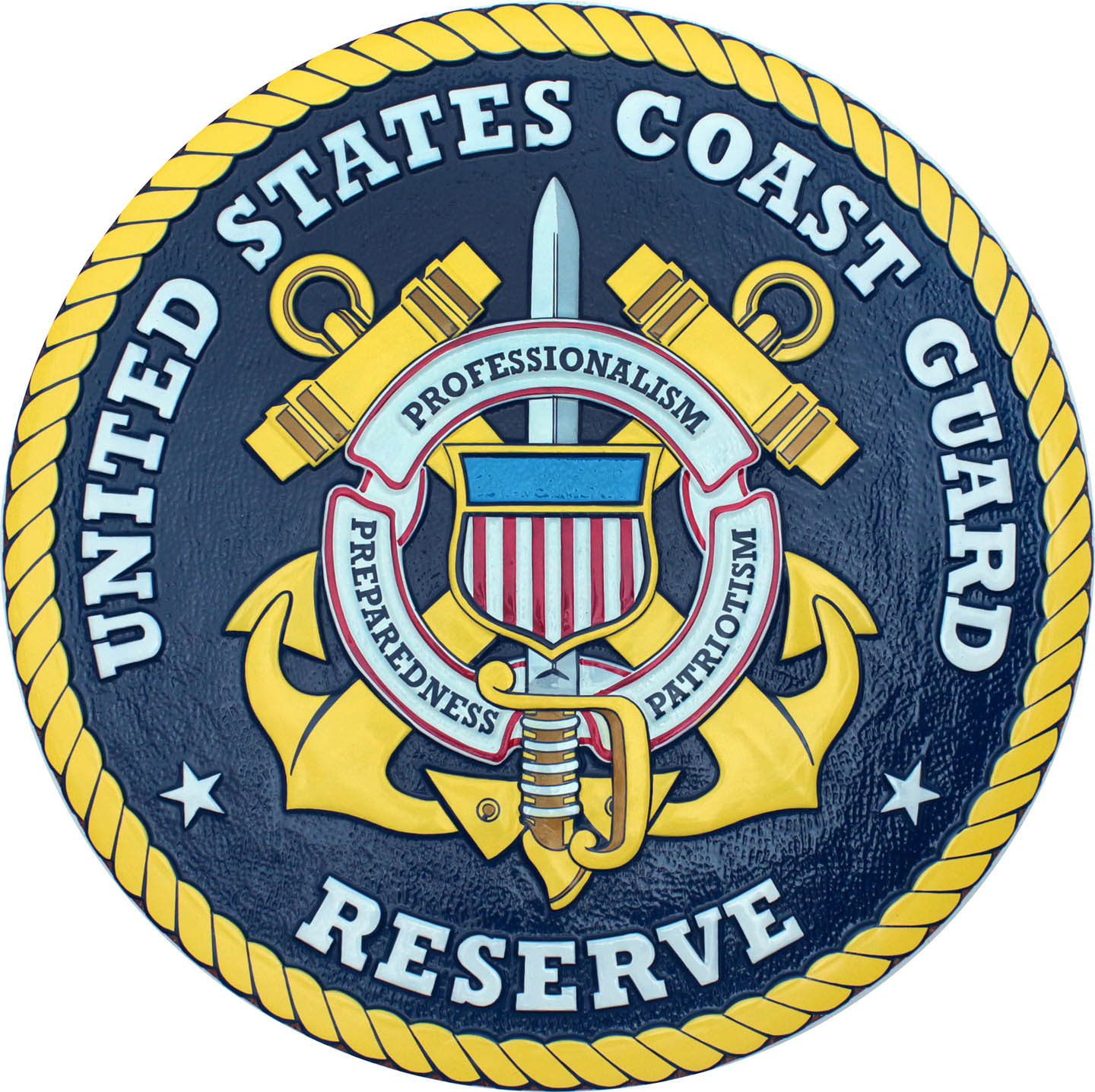 The USCG Reserve : the USCG seal signifies the following: The crossed anchors supporting the shield are adapted from the United States Coast Guard??s symbol. The colors dark blue, scarlet, and white are traditional colors of the organization while gold is emblematic of achievement and excellence.The sword symbolizes defense & the organization's military heritage. The motto PROFESSIONALISM, PATRIOTISM, PREPAREDNESS embodies the Coast Guard Reserve??s national security mission. The round shape of the motto scroll alludes to a life preserver and represents the Coast Guard Reserve's peacetime mission to help others.