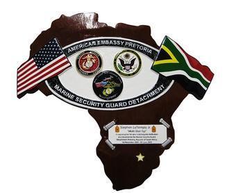 This presentation plaque was custom made for the MSG American Embassy Pretoria. A plaque, made of solid mahogany wood , handmade from carving, painting and finishing, is the most significant way of showing recognition to personnel under this unit. Careful attention to details is employed and can be altered according to your specifications. A perfect gift for retirement and graduation! A recessed hook enables the plaque to hang flush against any wall.