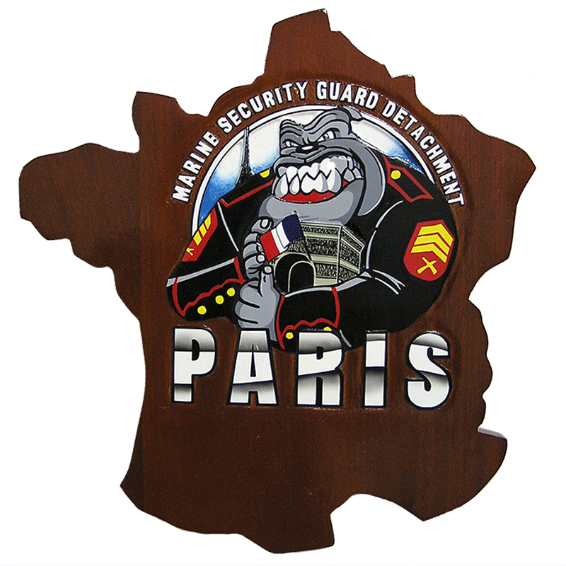 This plaque shows the emblem of the Marine Security Guard Detachment in Paris.