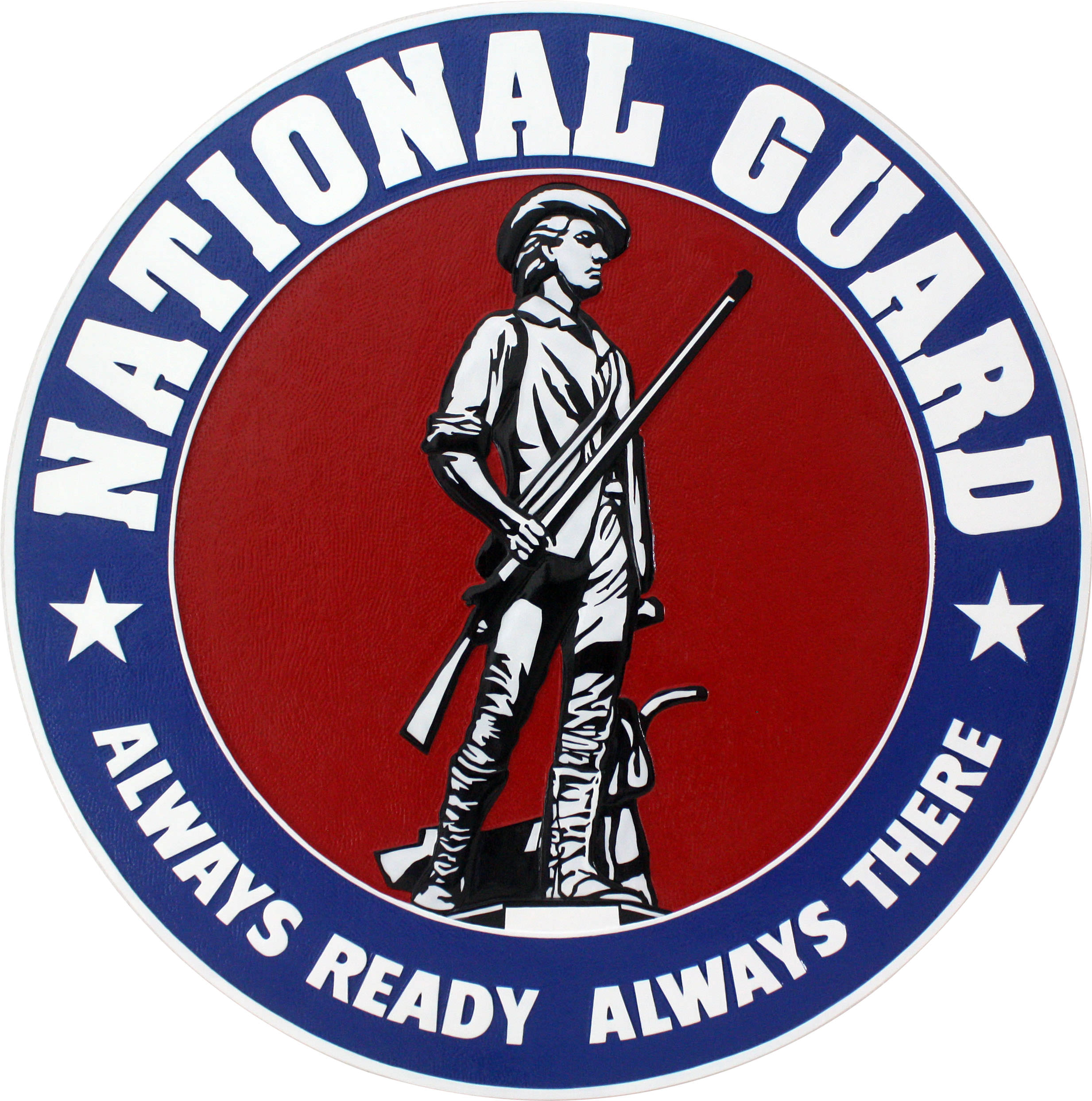 The modern National Guard logo, features a patriotic color scheme, the service’s official motto (“Always Ready, Always There”), and most notably a likeness of the iconic “Minutemen” who battled the British during the American Revolutionary War.