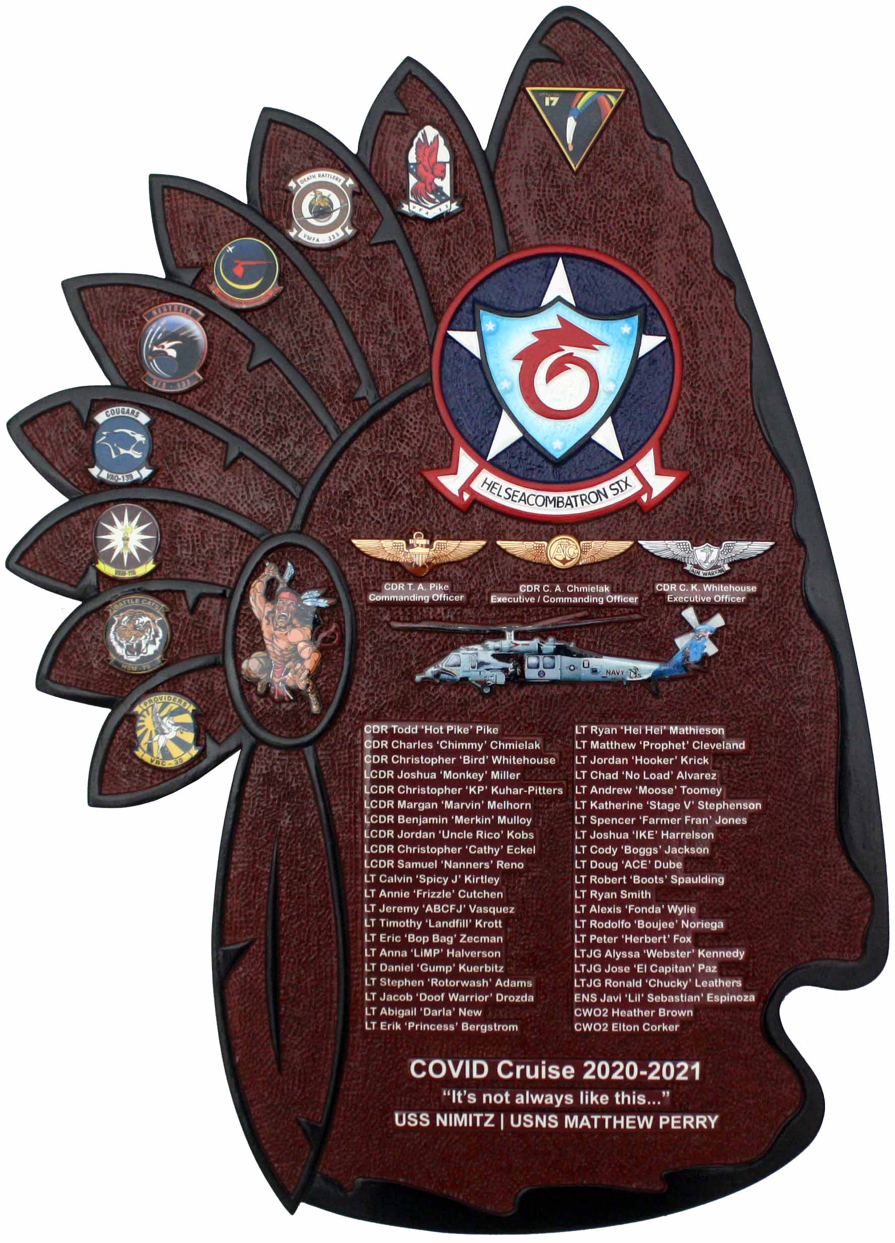 This Cruise Deployment Plaque is made from 100% mahogany handcrafted in full detail 3D look. This plaque was custom made for the service men and women of the USS Nimitz and USNS Mathew Perry to celebrate the COVID Cruise of 2020-21.