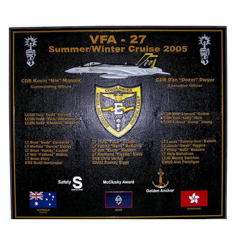 VFA 27 or known as the “Royal Mases” is the US Navy fighter squadron with a mission to conduct a carrier-based air strike, anti-ship operations, and more in support of Air Wing 5 tasking and requirements. Their dedication to their mission is shown on this custom plaque.