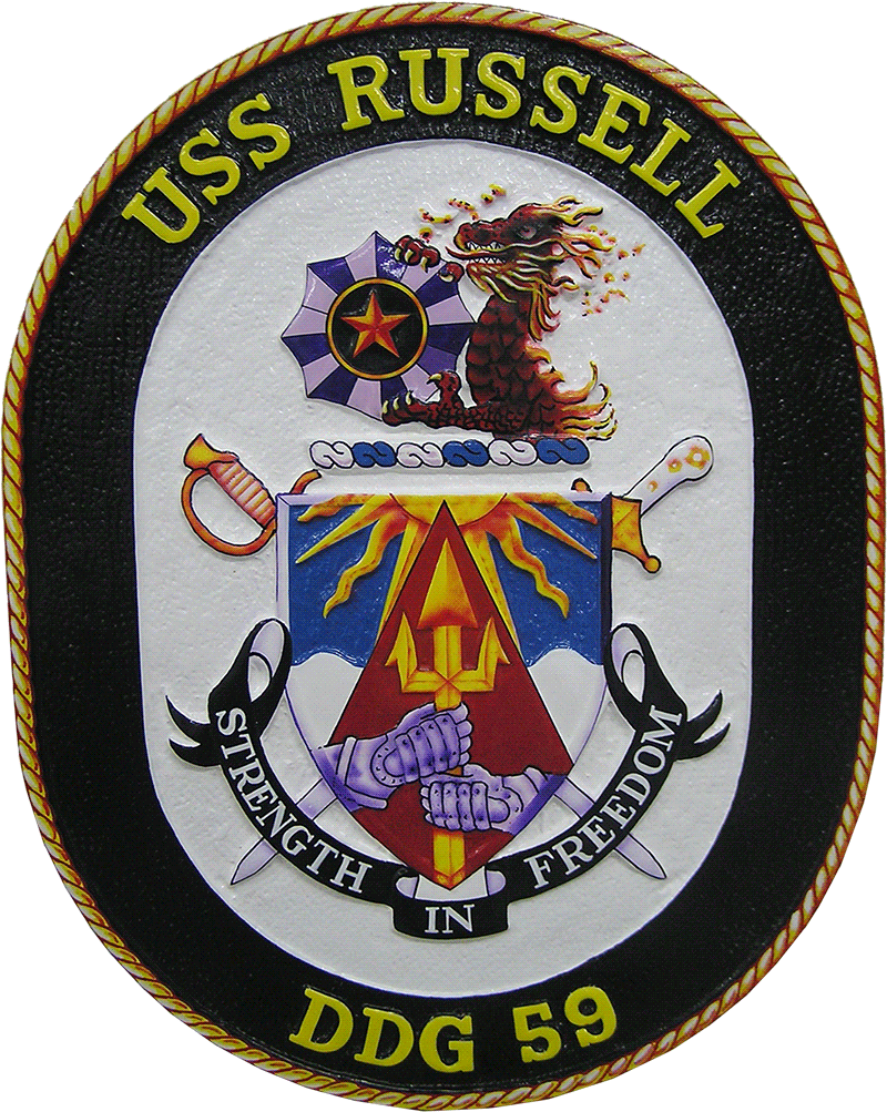 USS Russell DDG-59 is the second ship under the US Navy that carries the name Russell. It is name before Rear Admiral John Henry Russell and his son, John Henry Russell, Jr. The ship is launched on October 20, 1993 and still in active service. Wordings as shown is the plaque is their motto "Strength in Freedom".