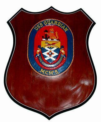The Ship's shield contains dark blue and gold are the colors traditionally associated with the Navy. The sea is reflected in the crested division and the color white. White recalls sea foam and breakers. The two white interlocking chevron shapes enclosing a detonating mine allude to the ship's cable tethered devices as well as offensive and defensive mining of important sea areas. They also personify the MCM's highly sophisticated capabilities of minesweeping to search, detect and neutralize mines. The trident, symbol of sea power, combined with the lightning bolt highlights traditional as well as modern naval warfare. The lightning flash is also a reminder that a high degree of automation and electronics technology is essential for a fast response in mine warfare.The crest's griffin, who is sharp of eye and keen of ear, is an appropriate symbol for the USS GUARDIAN. This mythological beast is also noted for its vigilance, courage, and strength. Its collar, in our National colors, honors the preceding USS GUARDIAN, a Radar Picket Ship launched in 1945. The anchor, adapted from the Rhode Island State flag, and the pineapple symbolizes the ship's first homeport Newport, RI. The total design underscores the Navy's reliance on mine warfare to clear critical sea lanes in the event of war.