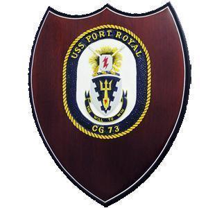 This presentation plaque bears the seal of the USS Port Royal at the center. It is handmade from carving to finishing .