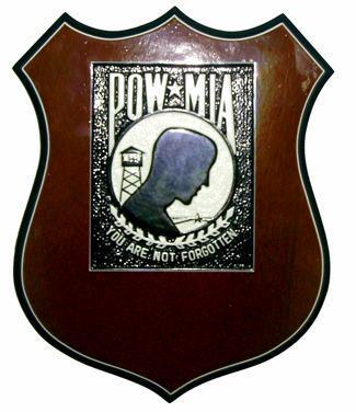 This shield shaped wall plaque shows the POW MIA Remembrance design