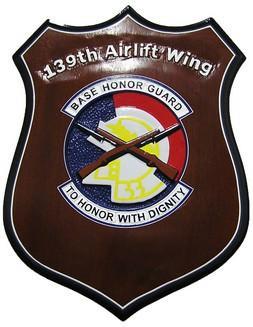This custom-design unit presentation plaque we made for the 139th Airlift Wing is made of the finest mahogany and is in dark wood tone finish. The center design and the name of the unit at the top are engraved in 3D relief which gives life to it when hung or displayed.