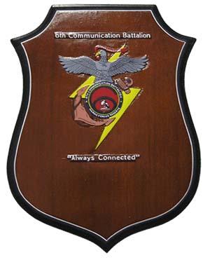 This solid mahogany wood item is made according to customer's specification bearing the 6th Communication Battalion insignia and motto " Always Connected" at the center .