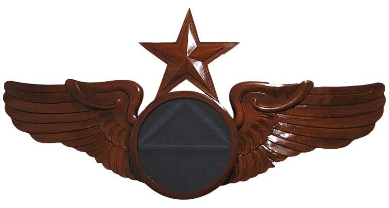 This is a retirement shadowbox made from quality mahogany wood. The dimensions of this Air Crew badge Shadowbox is 60" width x 30" height and 3" depth. It is finished with natural wood tone, and completed with high quality velvet pincushion and a real glass cover.