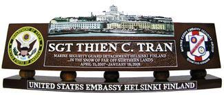 This item shows a Military Presentation Desk Name Plate. All MilitaryPlaques.Com Desk Nameplates are individually hand carved, hand painted and finished. The carving is in full "3D" relief. This desk nameplate can be customized without extra charge just specify the emblem, logo or rank pin cushion of your choice. This presentation desk nameplate is a perfect retirement gift or military memorabilia. Absolutely free of shipping in standard U.S and APO address--- Express shipping also available. Order now!