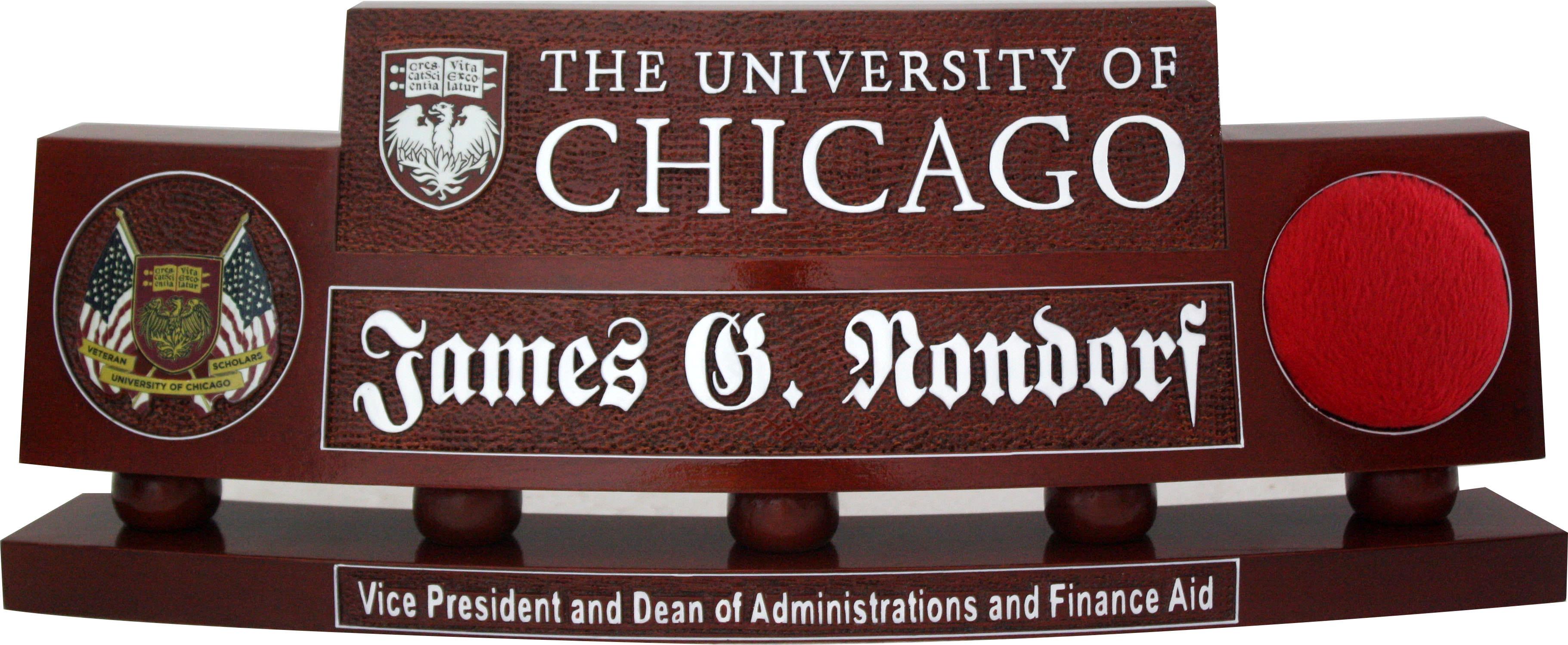 The University of Chicago Desk Nameplate is made from solid, dried, kiln mahogany wood. It is hand carved in full 3D relief, hand painted and finished. You can have ANY emblem or logo you require or a rank pin cushion. This Desk nameplate is a perfect retirement gift, graduation gift or a presentation and recognition award