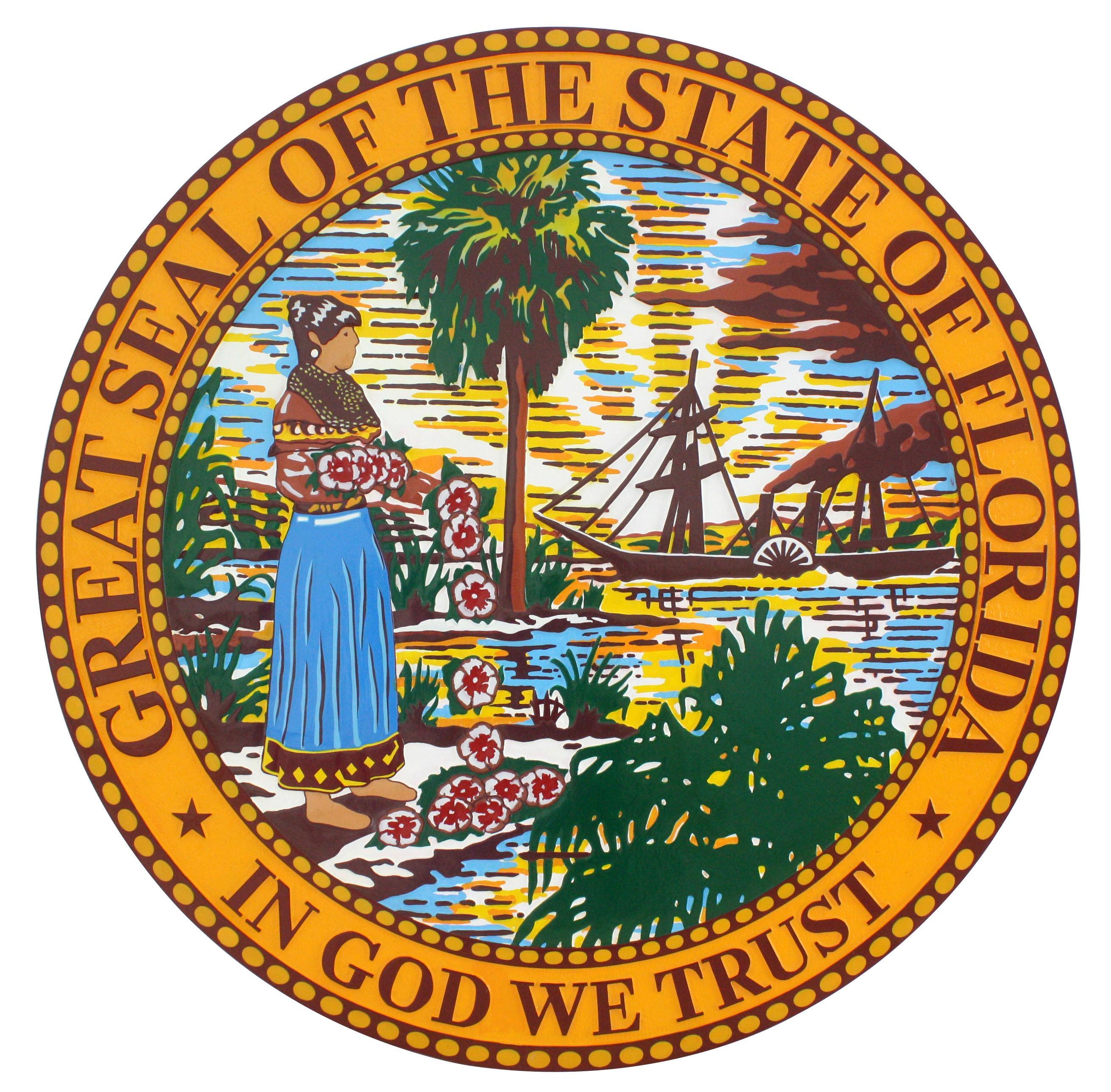 These solid mahogany wall plaques show the US States seals. Hand carved and hand painted mahogany wood plaque. A perfect as a wall plaque or podium plaque. Fantastic additions to any memorabilia collection. Great government retirement gift, government graduation gift, or government recognition awards. A recessed hook enables the plaque to hang flush against any wall. Florida State Seal Plaque: The seal features a Seminole Native American woman spreading flowers in the foreground, a sabal palm, which is the Florida State Tree, along a shoreline. In the background there is a steamboat set against the sun on the horizon with rays of sunlight extending into the sky. The seal is encircled with the words "Great Seal of the State of Florida", and "In God we Trust". The latest revisions took place in 1985 and this version of the Great Seal of the State of Florida appears to have been generally accepted as the definitive version.