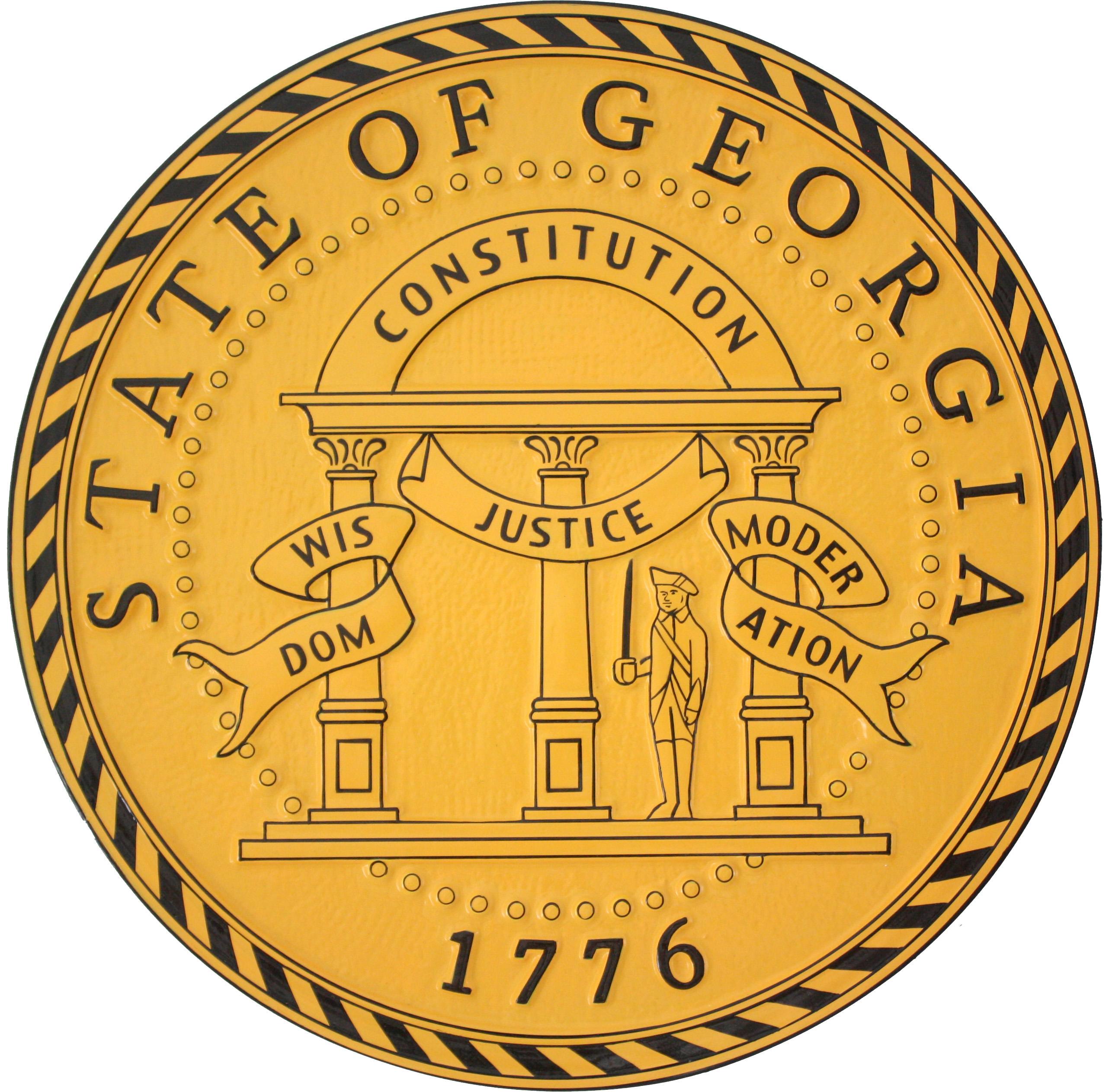 Georgia State Seal Plaque: The Great Seal of the state of Georgia features an arch that is supported by three pillars is a symbolic image of the Constitution. Georgia's official motto Wisdom, Justice, and Moderation, hangs from the pillars. The principles of the Constitution are being guarded by a man with a drawn sword. Circling the images are the words "State of Georgia 1776". In 1914, the legislature decided that 1776, representing the Declaration of Independence, was more appropriate than the 1799 date that formerly displayed on the seal.